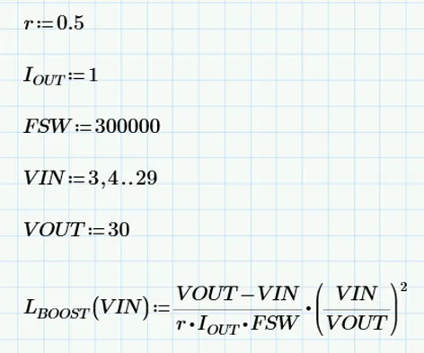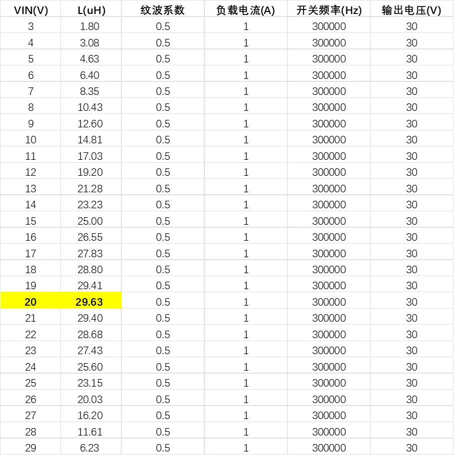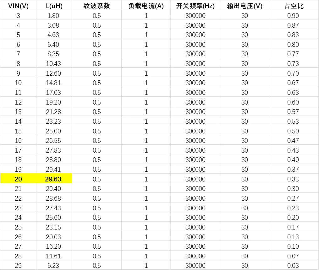给定r=0.5, I_OUT=1A , F_SW=300kHz , V_OUT=30V ,V_IN 范围从3V到29V。