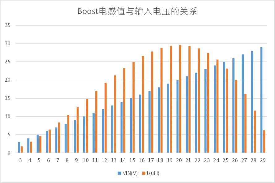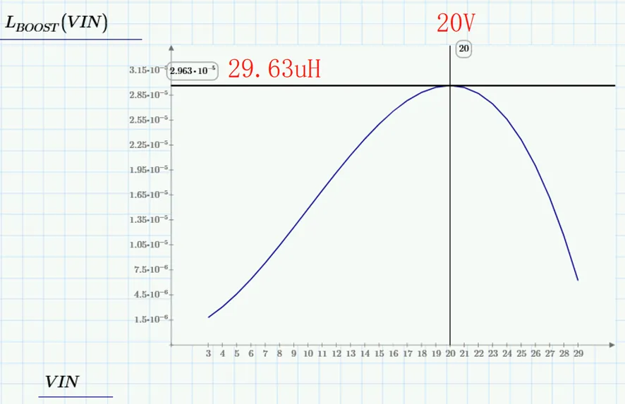 可见,电感量取得最大值的位置刚好是输入电压等于2/3倍输出电压处,也就是输入电压等于20V处。