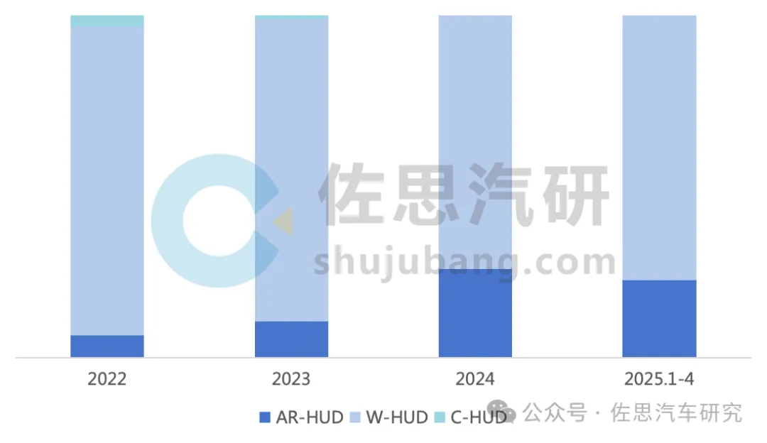 2022年-2025年4月,中国乘用车HUD分产品类型占比