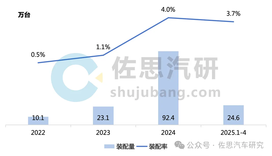 2024年全年,HUD装配量达355万台,同比增长63.0%,装配率达到15.5%,同比扩大5.2个百分点。2025年1-4月,HUD装配量接近110万台,同比增长27.6%。
