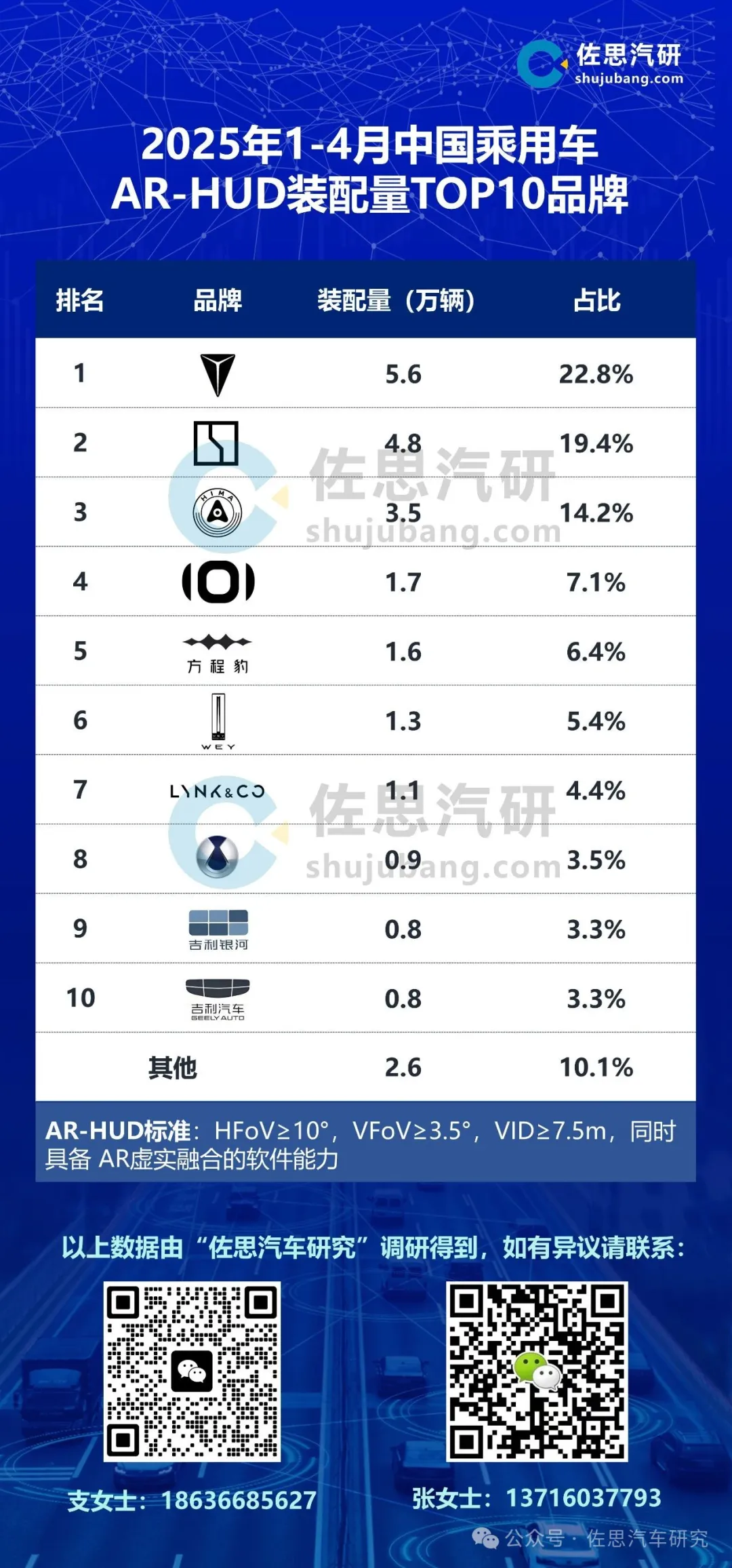 2025年1-4月,在AR-HUD装配量品牌排名中,深蓝汽车以5.6万辆排名第一,市占比达22.8%,该品牌旗下多款车型AR-HUD装配率为100%。