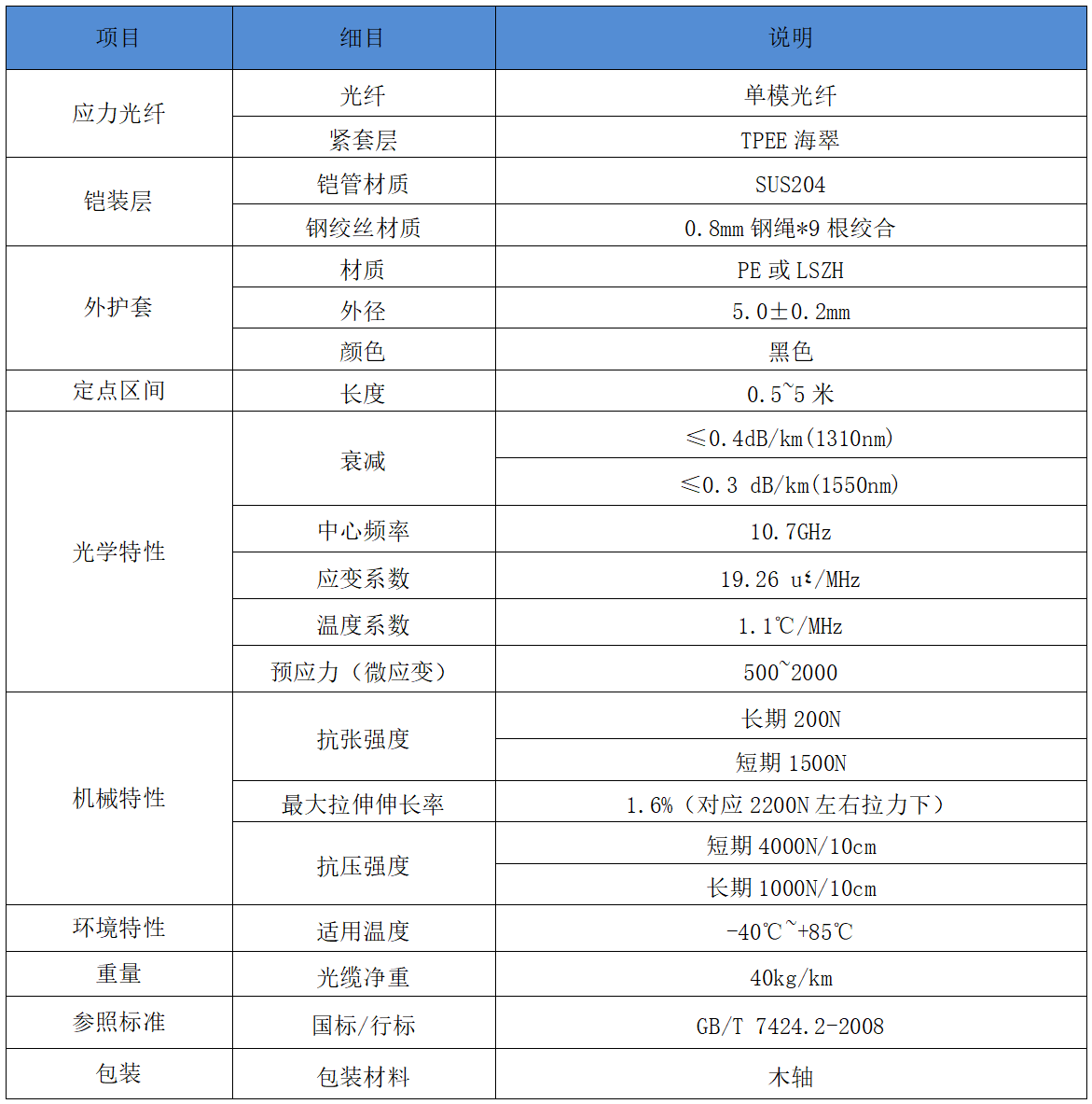 (1)预应力内定点式铠装应变光缆是一种专业BOTDR和BOTDA原理研究的一种应力、应变传感光缆,光缆由中心的微应变传感光纤,螺旋铠管,钢绳绞合层加强件,以及外护套组成。