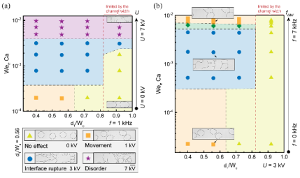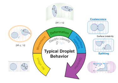 实验内容:油-油体系是对常用含水体系的补充研究,适用于许多与水或水性溶液不兼容的应用场合,从药物制备、涂层和复合材料生产、到能量收集和管理等等均有广泛的研究需求,本实验研究了以官能团为分类的不同油相液滴体系,如烷基、烃基、羟基和酯基等,并在电学和流动的耦合条件下,定义了五种典型的液滴行为:“无影响”、“移动”、“变形”、“界面破裂”和“混乱”,提出了流-电耦合场下这一新的无量纲数判定准则。