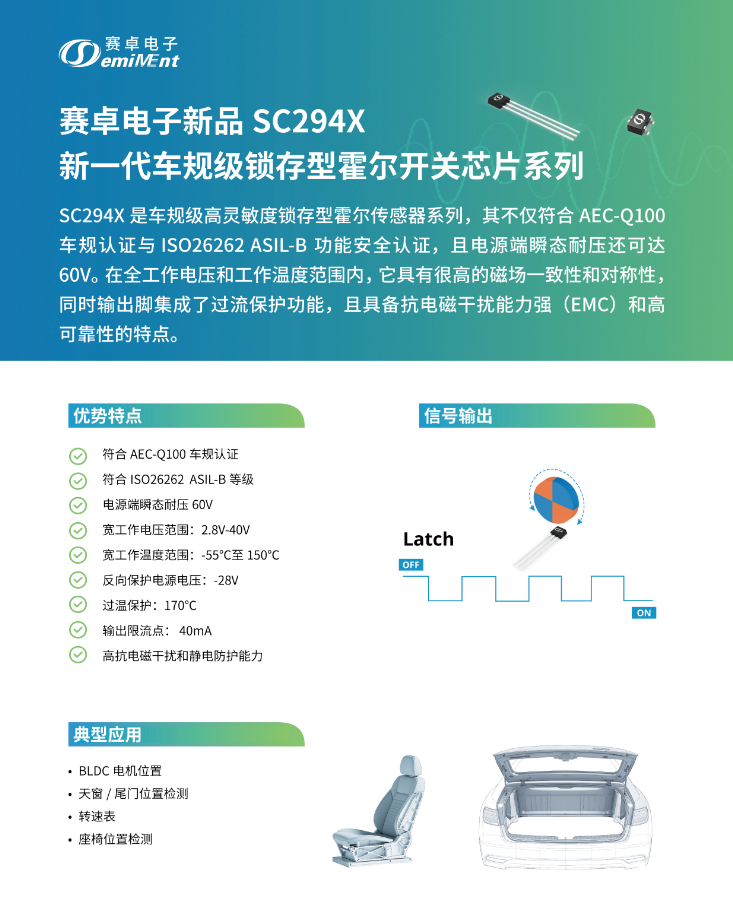 SC294X 是车规级高灵敏度锁存型霍尔传感器系列,其不仅符合 AEC-Q100 车规认证与 ISO26262 ASIL-B 功能安全认证,且电源端瞬态耐压还可达60V。在全工作电压和工作温度范围内,它具有很高的磁场一致性和对称性,同时输出脚集成了过流保护功能,且具备抗电磁干扰能力强(EMC)和高可靠性的特点。