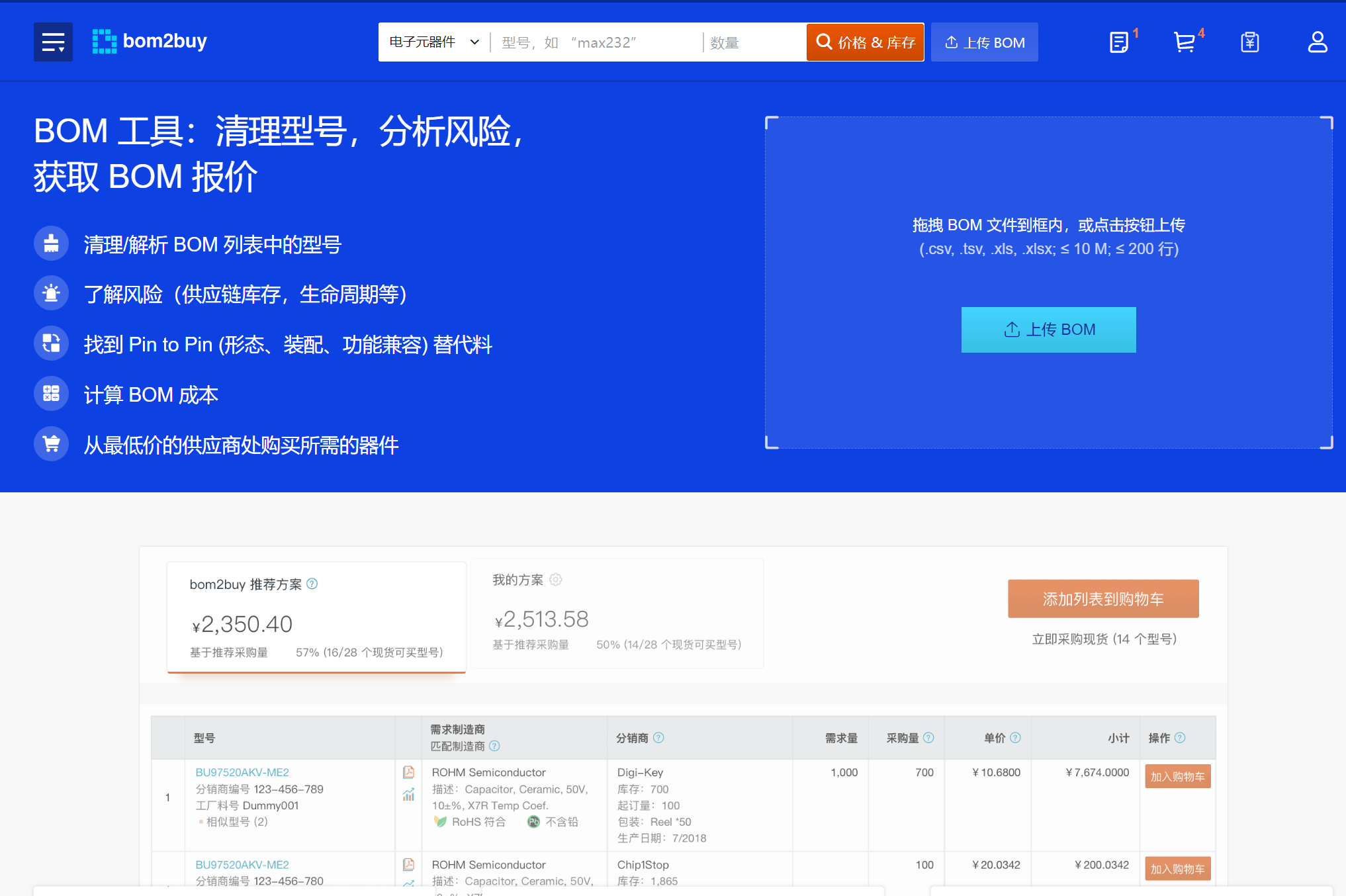 处理 BOM 是采购人员繁琐又重要的工作。bom2buy 平台的 BOM 快速配单功能强大,能大大提高工作效率。你可以将 BOM 表直接导入平台,平台会自动分析处理 BOM 表,快速匹配符合要求的元器件,并列出每个元器件的供应商、价格、货期等信息。同时,还会优化 BOM 表,推荐性价比更高的替代方案,帮你降低成本。例如,有一份包含 50 种不同型号元器件的 BOM 表,使用该功能几分钟就能完成配单,而传统方式可能需数小时甚至数天。