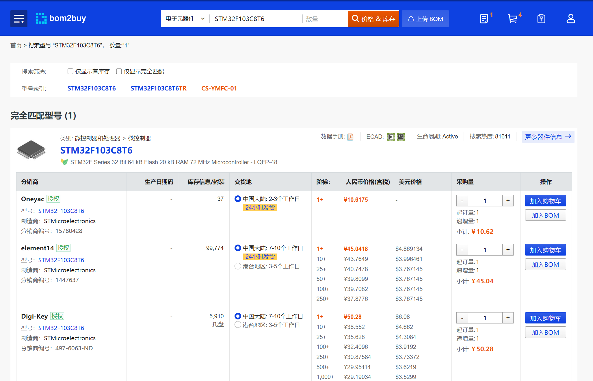 bom2buy 平台拥有超 6.5 亿个元器件型号,涵盖市场上绝大多数主流品牌和型号。无论采购常见电阻、电容、二极管,还是高端芯片、传感器等,都能在平台上轻松找到。打开 bom2buy 官网(https://www.bom2buy.com/),在首页搜索栏输入想采购的元器件型号,如“STM32F103C8T6”,点击搜索按钮,瞬间就能显示该型号的详细信息,包括产品价格、库存、规格参数、品牌、供应商、封装等,让你对产品有全面了解,如同拥有一个元器件的“百科全书”。