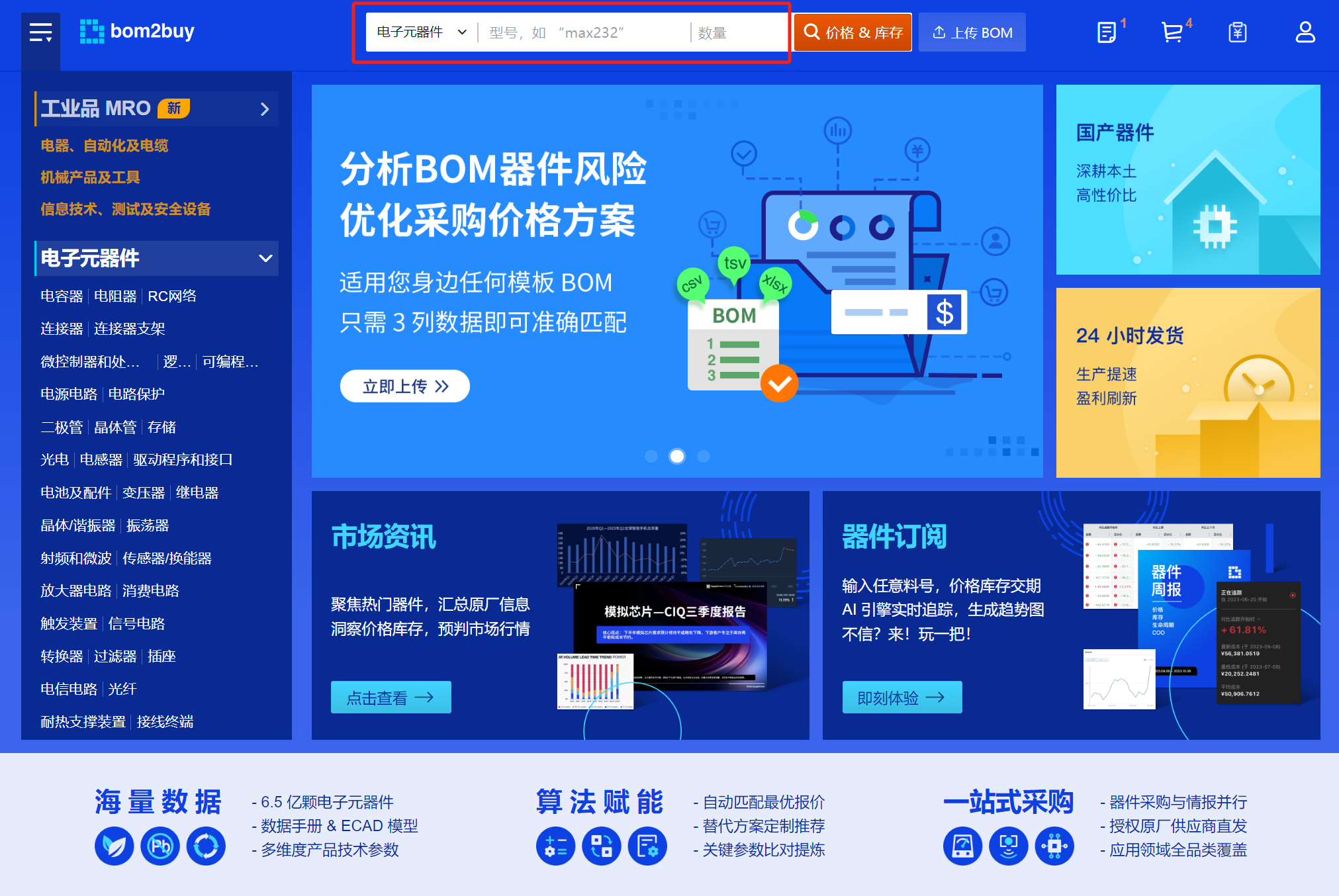 第一步:网站打开bom2buy,点击首页上方搜索栏