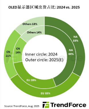 2024年因品牌厂以北美作为OLED显示器的重点发展地区,北美的出货占比达44%,为全球最高。2025年由于国际形势带来较大变数,预期品牌为了分散风险,致力提升欧洲和中国市场的出货比例,将促使北美出货占比下降至33%。