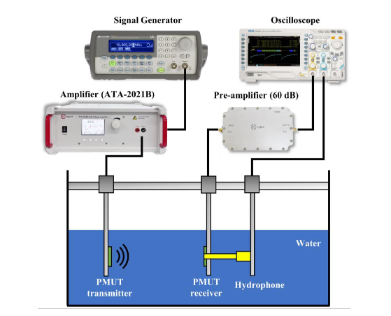 实验过程:为了测量PMUT的水下接收灵敏度,使用了来自研究机构的商用标准水听器。同时,将PMUT*用作发射器,将商用标准水声换能器PMUT作为接收器放置在距离发射器约3.6cm的地方,依次接收超声。信号产生输出一个1Vpp、5个循环的脉冲正弦波信号,该信号被功率放大器(ATA-2021BAigtek)放大60倍,以激励PMUT发射器发射声波。波通过水介质传播,并被PMUT接收器和水听器表面捕获,经过前置放大器放大后在示波器上读取和分析水听器和PMUT接收器电压的峰峰值。