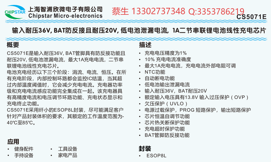 还在为锂电池充电芯片的耐压、防反接、充电效率发愁?上海智浦欣微电子 CS5071E 来了,一站式解决你的充电痛点!核心优势拉满,安全感与效率双在线。