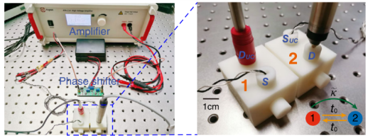 实验过程:我们用一个外部电路来产生幅值和相位同时可调的非互易复数耦合,其原理是:1号空腔内的声场由麦克风D2拾取,经功率放大器放大和移相器调相后,由扬声器S2输出至2号空腔。由于麦克风和扬声器的单工特性,2号空腔内的声场无法通过外部电路耦合到1号空腔。非互易耦合的幅值和相位可分别由功率放大器的增益和移相器的相位进行调控。