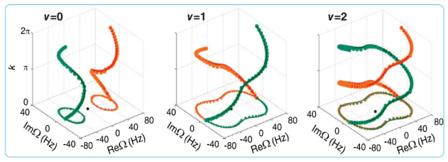 固定功率放大器的增益G=5.5,并逐点调节移相器的相位,拟合声压传输响应数据得到非互易耦合在复空间的变化。将拟合得到的参数代入到哈密顿量中求解本征值,得到两条声学复能带结构,此时两条能带互不干扰,对应平凡链环。当增大功率放大器的增益G至8.5,相位同样变化一圈时,相应地,两条复能带动量区间内编织1次,实现平凡扭结。