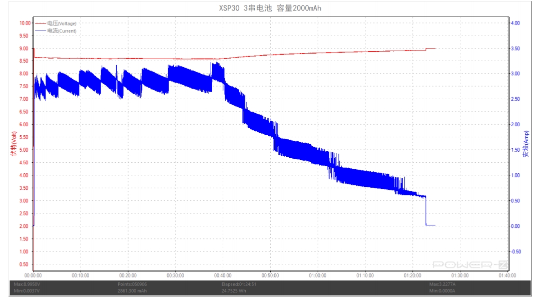 实测数据显示,在电池容量为2000mAh、3节串联锂电池、使用PD协议充电器输入9V/3A(27W)功率的条件下,XSP30仅需1小时即可将电池充至80%,1小时30分钟即可完全充满,展现了其卓越的充电效率。