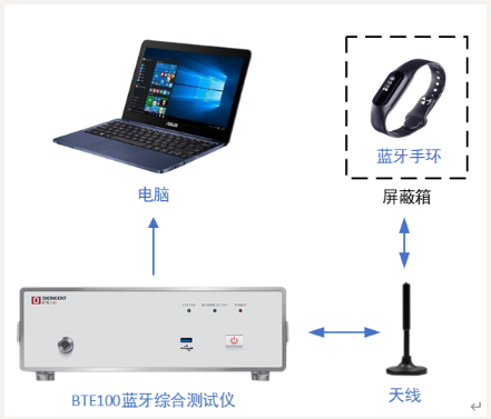 单终端蓝牙射频一致性测试系统主要包括:BTE100蓝牙综合测试仪、天线或射频线缆、控制电脑和被测物。