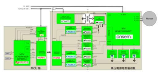 在IPM模块设计方面,方案采用onsemi旗下NFVA23512NP2T芯片,其内置3个高速半桥高压栅极驱动电路,集成(1200V/35A)低损耗的IGBT管,内置高边自举二极管,最大支持20kHz的PWM,死区最小时间为2μs。并且器件还提供多个保护功能,包括欠电压锁定、过电流锁定、驱动与集成电路的温度监测和故障报告等,可为汽车电机带来高性能与高安全特性。