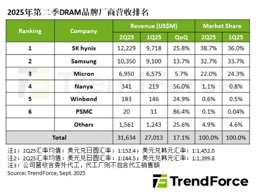 2025年第二季DRAM产业因一般型DRAM (Conventional DRAM)合约价上涨、出货量显著增长,加上HBM出货规模扩张,整体营收为316.3亿美元,季增17.1%。平均销售单价(ASP)随着PC OEM、智能手机、CSP业者的采购动能增温,加速DRAM原厂库存去化,多数产品的合约价也因此止跌翻涨。