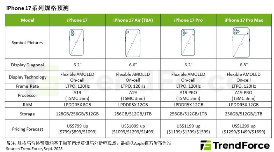 TrendForce集邦咨询表示,iPhone 17 Air标志着Apple正式开辟轻薄型旗舰机的新战局,但由于压缩电池容量及精简相机规格,可能难以完全满足偏好大电池与高画质拍摄的消费需求。TrendForce集邦咨询认为,Air初期出货占比预计将与过往Plus系列相当,实际销售表现仍待观察。