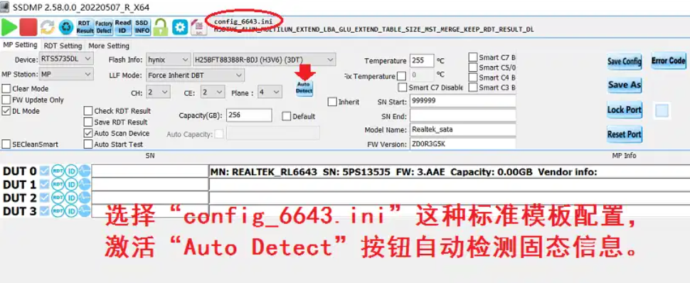 2、软件扫描到新设备后,点击界面顶部蓝色齿轮图标,把配置文件选择成“config_6643.ini”这种标准模板配置,即可激活“Auto Detect”按钮(有的软件已被锁定无法更改设置,需要点击界面顶部绿色小锁图标,输入密码“realtekssd”即可解锁)。