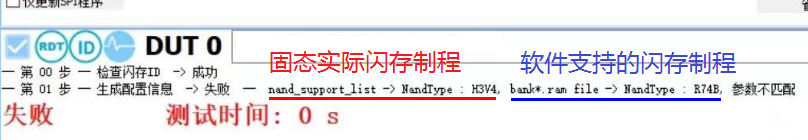 另外,针对RM1135主控不知道怎么确定固态实际闪存制程的,可以通过以下两种方法确定。第一种是下载量产部落网的Realtek flash id软件检测;第二种是先随便下载个RM1135开卡工具,打开软件直接点击软件最左上方的绿色三角图标开始,软件肯定会报错,然后就会提示“NandType……参数不匹配”,并给出参考信息,这样就知道固态实际采用的闪存颗粒制程了,如下图示例(仅做演示)。