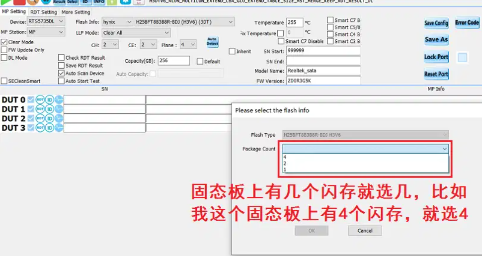 3、然后点一下“Auto Detect”自动检测和匹配闪存型号,“Package Count”弹出框是用来选择闪存颗粒数量,比如我这个固态正反各有2颗闪存颗粒,共4颗,“Package Count”就选4。检测完成后,在软件左上方点绿色三角图标进行开卡。