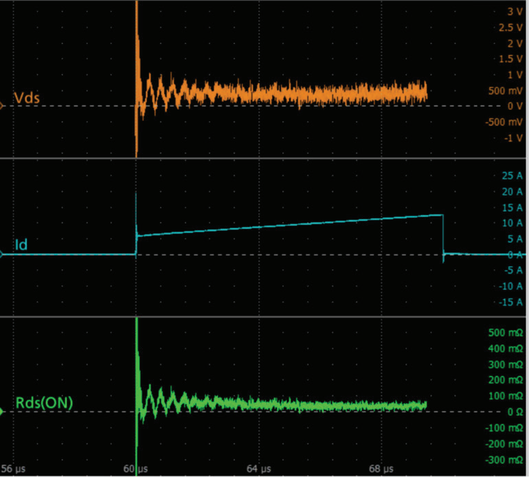 图1. RDS(on)波形表征FET导通状态下,漏源电压(VDS)与漏极电流(ID)的动态比值关系。