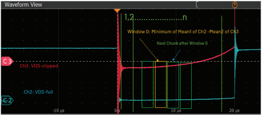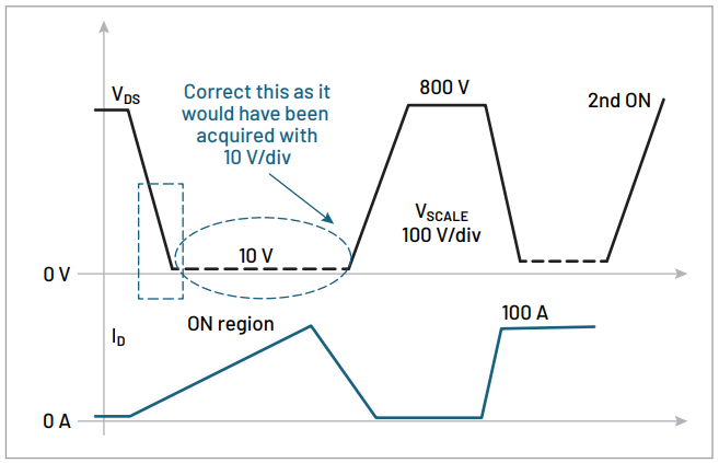 - 另一个差分探头仅以高灵敏度捕获RDS(on)区域,在FET导通且VDS较小时提供高分辨率。这相当于有意削剪VDS上的信号。注意这种方法类似于使用二极管钳位电路削剪信号,但需要应用校正以获得良好结果。