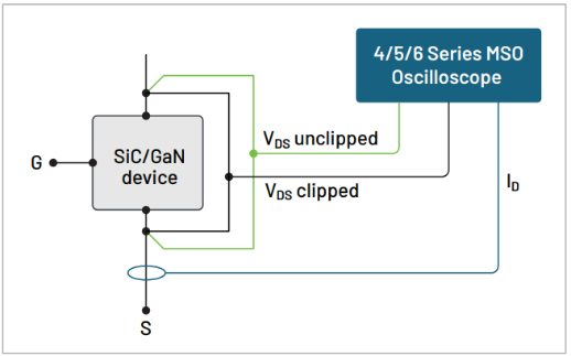 图8. 低边FET动态RDS(on)测量测试配置示意图。需注意:两个高压差分探头分别连接在FET的漏极和源极端子。