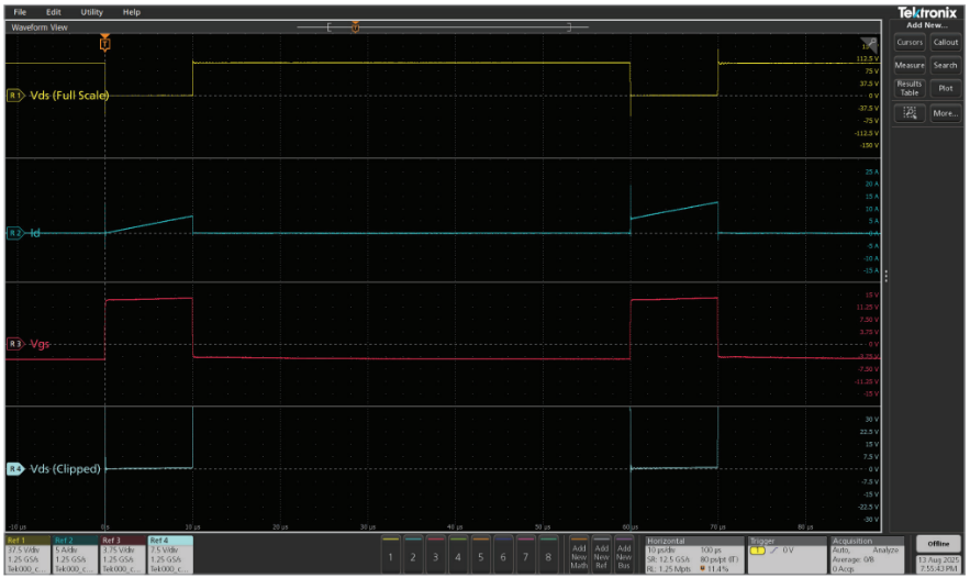 通过算法整合全量程VDS(on)段(高动态范围)与削波VDS(on)段(高分辨率),生成精确的导通电阻特性曲线。此校正通过使用未削剪的全量程信号生成低频偏移校正,保持削波样本中的高分辨率信息。结果是具有导通时间内增强垂直分辨率的复合VDS波形。导出的VDS表示导通区域,就好像时域波形是以较低垂直刻度采集的。