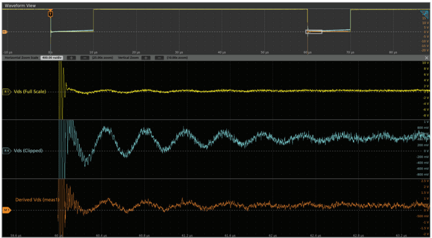 如前所述,如果使用低灵敏度(高V/div)捕获整个VDS范围,关断状态下的电压仅代表示波器模数转换器(ADC)和探头放大器量程的一小部分,因此采集分辨率低。一种可能的方法是使用高灵敏度(低V/div)采集低导通电压,以充分利用差分探头和示波器量程。然而,使用高灵敏度采集高幅值信号会使差分探头中的放大器过载,导致在短暂的过载恢复期间产生不准确数据。