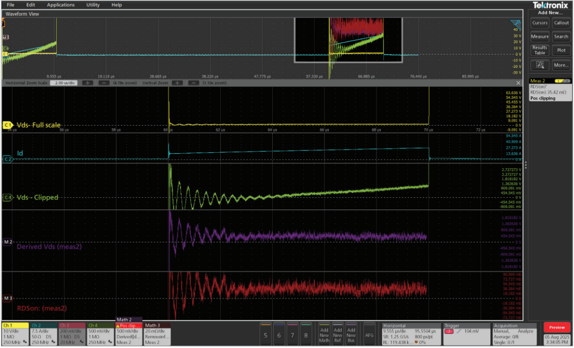 图7. 配置WBG-DPT双脉冲测试分析功能的5系列B MSO示波器正在进行动态RDS(on)测量