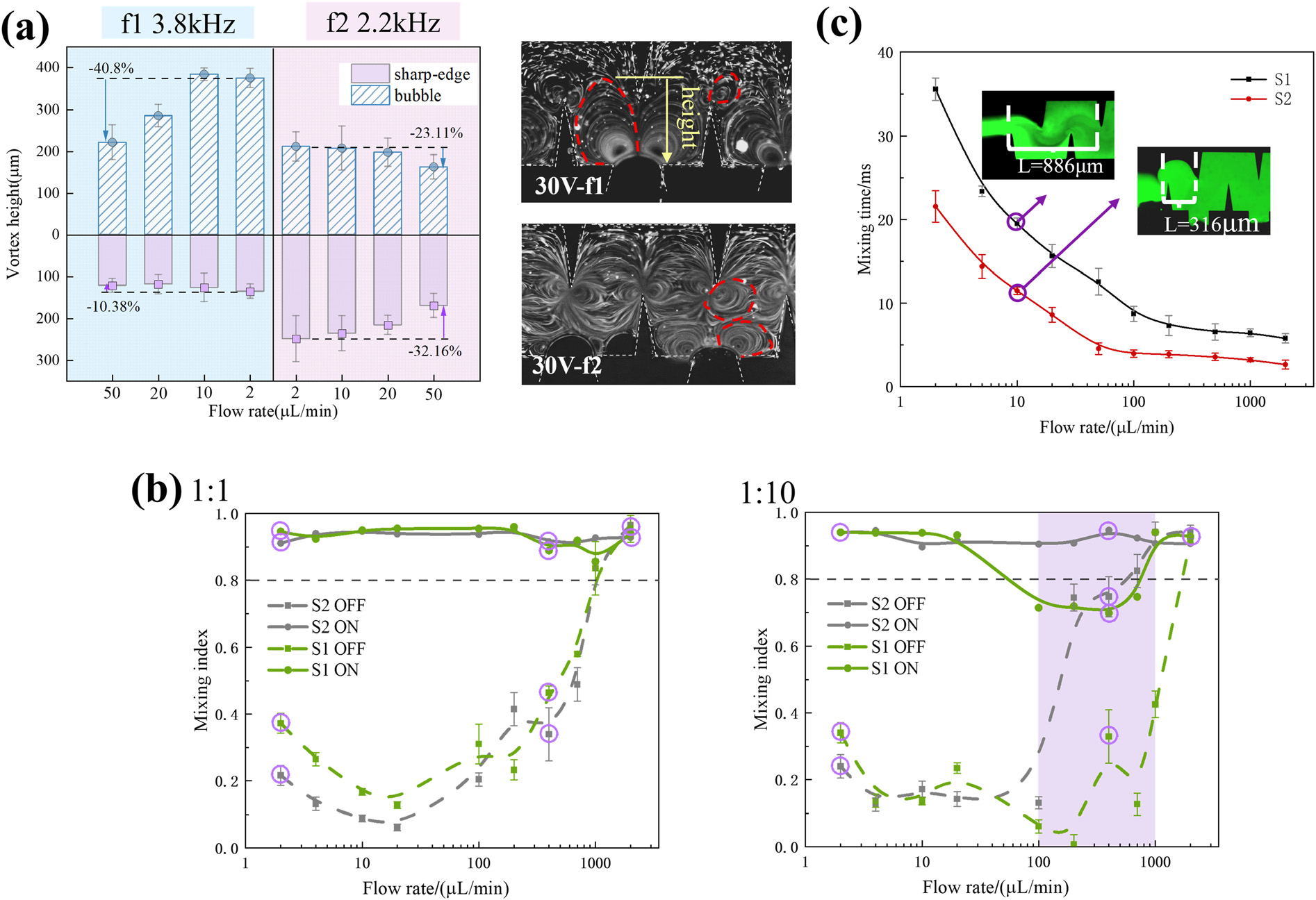 该实验系统通过信号发生器生成2.6±2kHz的声学驱动信号,经ATA-308功率放大器放大至驱动压电换能器,激发微通道内尖锐边缘与气泡的协同振动,产生逆向涡流扰动。将荧光溶液与去离子水以1:1至1:10的流速比例注入微混合器,记录荧光分布和计算混合指数M评估混合效率。针对不同结构(S1单锐边、S2锐边-凹槽复合结构),在10–1000μL/min流速范围内验证混合时间与均匀性。采用LARP法连续合成CsPbBr3钙钛矿纳米晶:将CsBr/PbBr2的DMF前驱体溶液与抗溶剂IPA以1:10比例注入声学混合器,利用超快混合触发成核与定向生长。