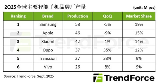 Xiaomi[小米含Redmi(红米)和POCO]生产总数为4,200万支,市占位居第三;其持续拓展拉美、非洲等新兴市场,加上中国补贴政策助力,产能表现稳定。Oppo[含OnePlus(一加)和Realme]第二季随着库存调整结束,产能逐步回升,生产总量近3,700万支,季增约35%,维持排名第四。