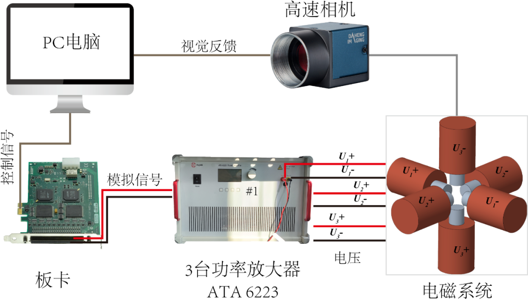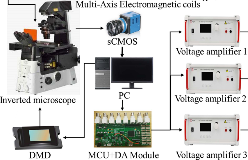 本实验,在倒置显微镜下,使用三台ATA-2042高功率放大器分别连接微控制芯片的输出端和电磁线圈系统的5个线圈。通过上位机发送指令经过放大器放大特定倍数后实现对电磁线圈系统的控制,利用电磁线圈产生多模态磁场控制光聚合机器人的运动。