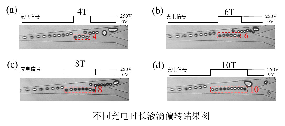 实验结果表明,基于ATA-2161高压放大器的静电诱导分选系统通过时序调控与电场优化实现了高精度液滴操控,充电脉冲宽度为液滴生成时间(0.625ms)的整数倍(n=1-10),调控单次触发分选液滴数(4/6/8/10)。该系统通过时序标定、参数匹配及结构优化,实现了亚毫秒级分选控制能力,为高活性细胞与微球的精准操控提供了可靠解决方案。