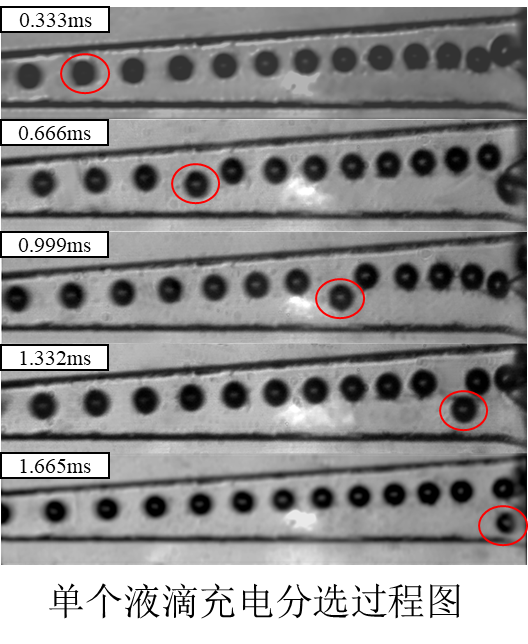 实验内容:通过静电诱导机制对液滴进行充电,利用非均匀电场实现带电液滴的偏转分选。充电信号由信号发生器产生,经ATA-2161高压放大器放大后施加至充电电极,使得液滴表面积累电荷。带电液滴在偏转电极产生的电场作用下定向偏转至目标收集通道。实验分析了液滴生成频率、充电电压、脉冲宽度等因素对分选精度的影响,验证了系统在液滴分选中高活性和高效率的性能。。