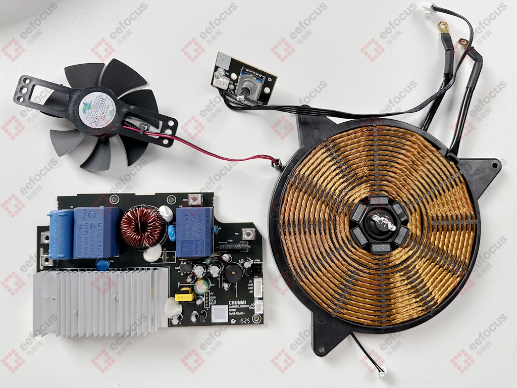 After disassembly, apart from the induction cooker's outer shell, the main internal components include a cooling fan, power switch, power adjustment knob, heating coil, and PCB motherboard. Let’s take a closer look at each part.