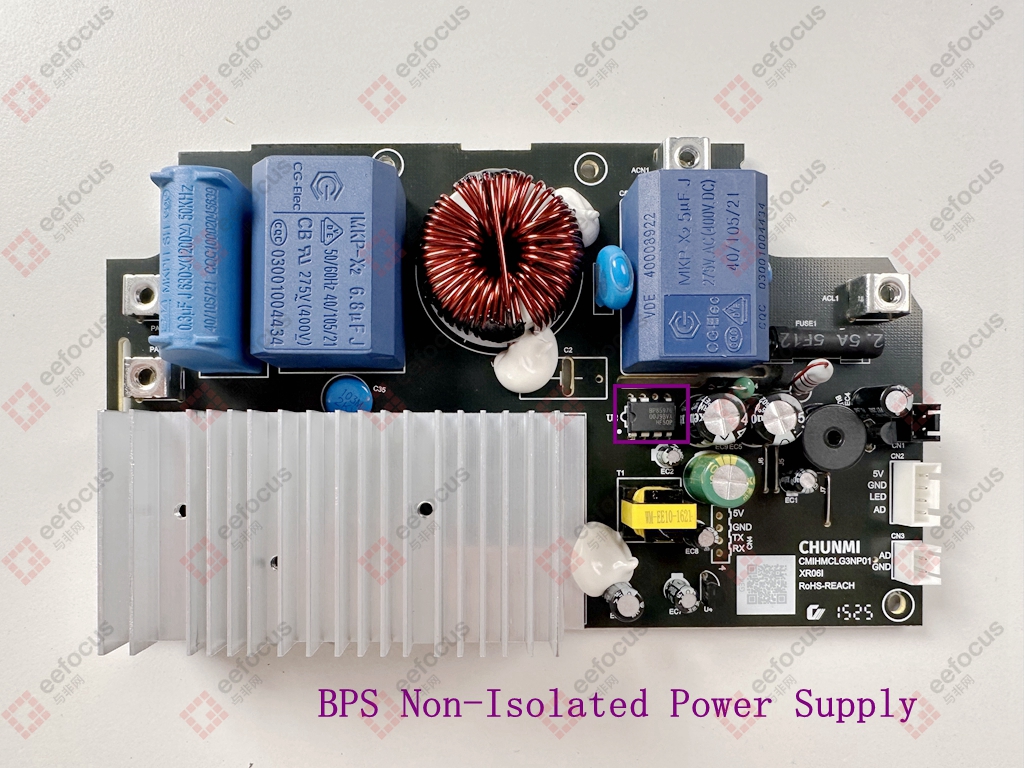 Starting with the PCB motherboard, the upper right section in the image below shows the input interface, equipped with a fuse and connected to 220V AC power. The lower right section is the low-voltage part, which uses a non-isolated power supply chip (BP85976) from Bright Power Semiconductor in a DIP7 package to output 18V DC. This is further stepped down to 5V via a transformer. These outputs power the cooling fan, main control unit, buzzer, LEDs, etc.