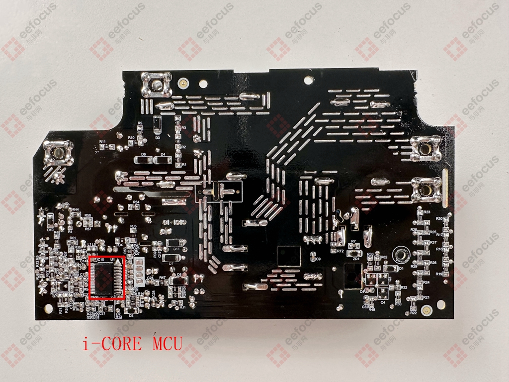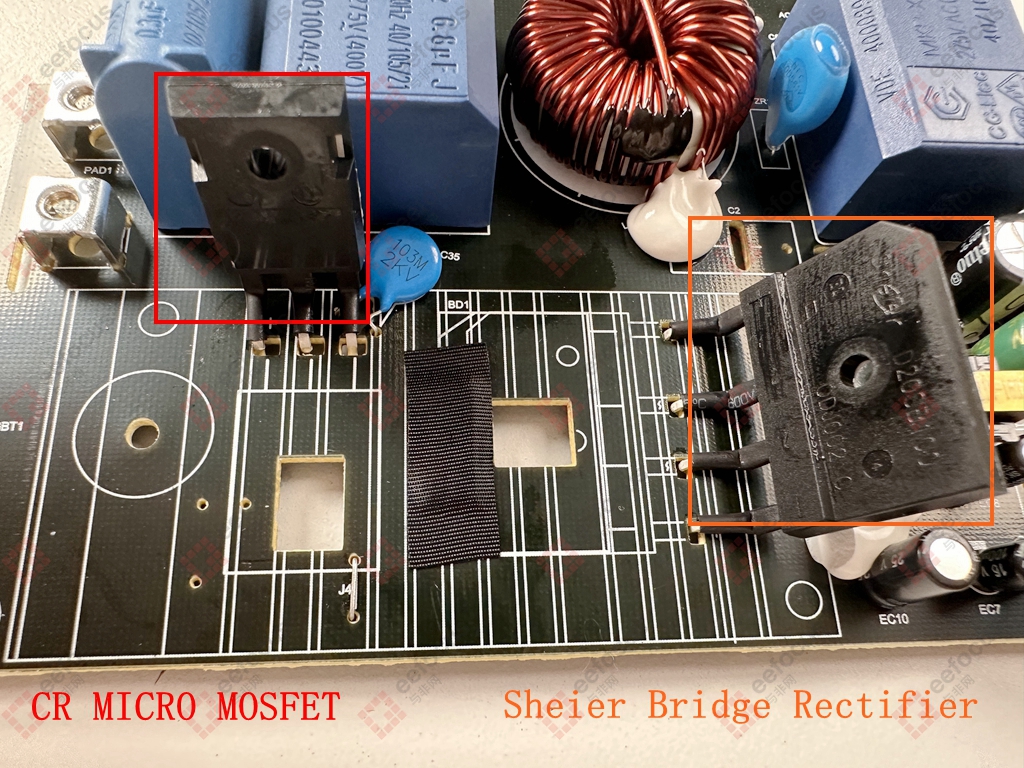 Beneath the heat sink are Leshan Sheier’s single-phase fully controlled rectifier bridge module (D20SB100) and CR Micro’s N-channel MOSFET (CRG25T135BKR3S). The filtered mains power first passes through Leshan Hill’s rectifier for conversion to DC. This DC power is then switched on and off by CR Micro’s N-channel MOSFET to achieve high-frequency current. Both of these power components generate significant heat, hence their placement under the heat sink.