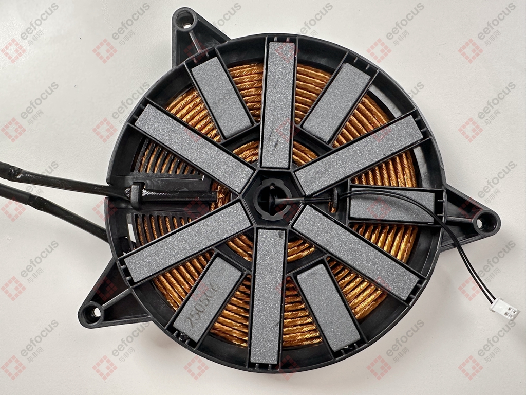 The heating coil is wound with enameled wire, meeting the induction cooker’s requirements for electrical insulation, compact layout, and efficient thermal conversion. The two thicker wires in the image above connect to the heating interfaces on the PCB motherboard. During actual heating, when you place a compatible pot (typically made of magnetic materials like iron or stainless steel) on the cooker’s surface, the alternating magnetic field’s lines of force penetrate the pot’s base. The pot’s bottom, due to cutting these magnetic lines, generates strong eddy currents. These currents, encountering the pot’s inherent resistance, convert electrical energy into heat via the Joule heating effect, rapidly heating the pot and its contents. Since the heat is generated directly in the pot itself, the thermal efficiency is exceptionally high, often exceeding 90%.
