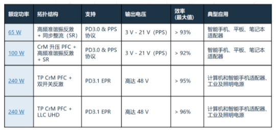 - 采用图腾柱CrM PFC + 双开关准谐振反激拓扑
