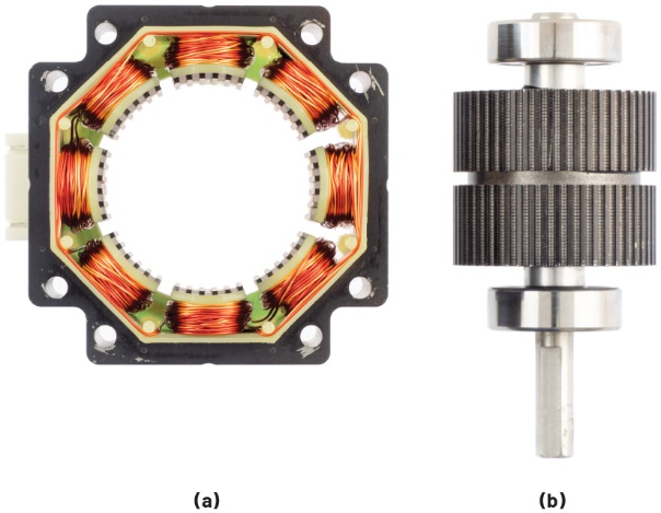 图1.混合式步进电机结构。(a) 8极定子。(b)永磁转子。