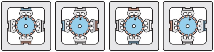 如图2所示,当电流通过电机线圈时,会产生一个磁场;该磁场会吸引或排斥永磁转子,从而驱动转子旋转,直至与磁场对齐。为了保持电机持续旋转,每个线圈必须交替通电,以确保磁场始终领先于转子位置。