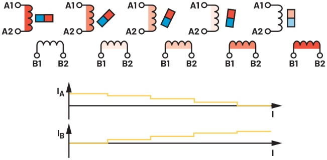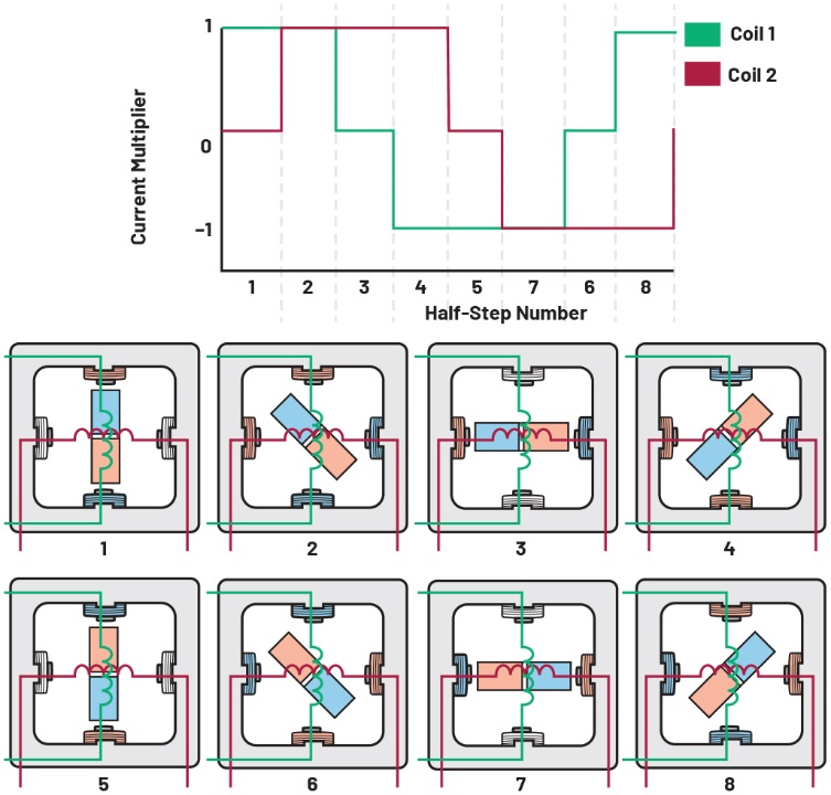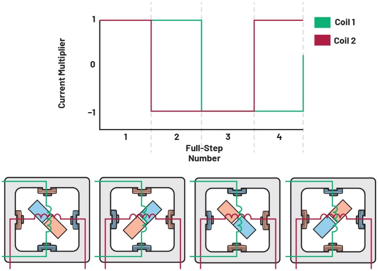 在全步进模式下,驱动器使用正电流或负电流为两个线圈通电。两相同时通电,以实现最大扭矩。切换线圈中电流的方向,会导致线圈绕轴旋转。切换模式(也称为换相)通常遵循图4所示的周期序列。