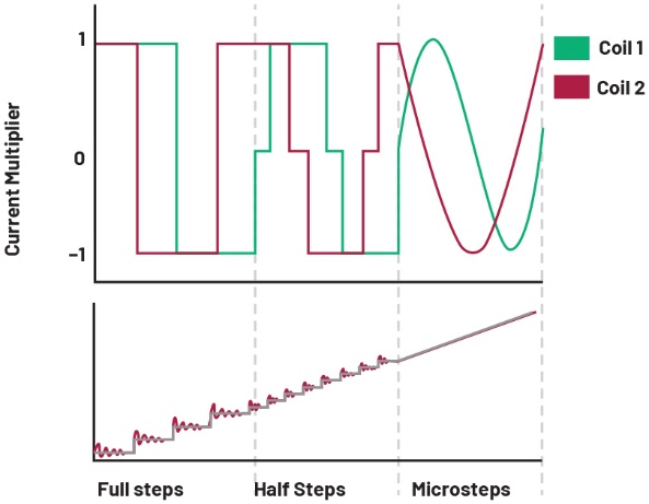 此外,由于微步进的步长较小,位置过冲也显著减小。这带来了许多优点,包括振动更小、效率更高、运动更平稳。机械振动会消耗能量,还会给某些应用中(如数控铣床)造成额外的磨损并影响可靠性。通过减少机械振动和噪声,微步进技术还能减少与操作电机控制系统相关的成本和能源浪费。