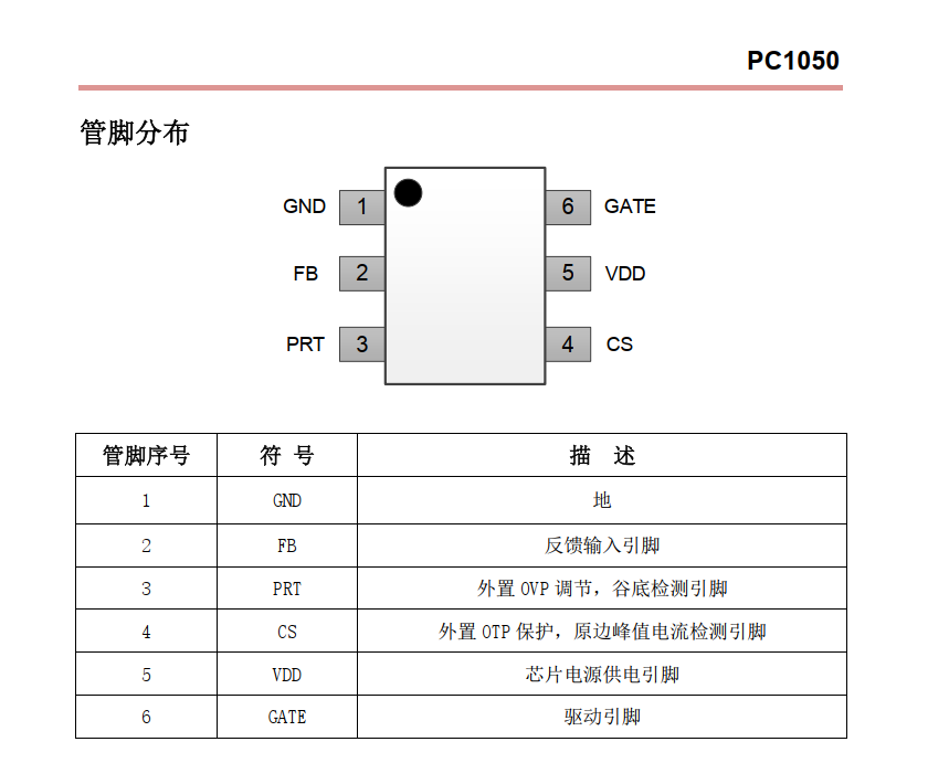 PC1050 是一款高性能高可靠性电流控制型 PWM 开关控制芯片,满足六级能效标准,具有谷底锁定模式。PC1050 集成多种工作模式,在重载情况下,系统工作在谷底锁定模式,以降低开关损耗,同时结合 PFM 工作模式提高系统效率;在轻载或空载情况下,系统工作在Burst Mode 模式,有效的去除了音频噪音,同时在该模式下, PC1050 本身损耗较低,因此可以做到更低的待机功耗。PC1050 还集成了多种保护模式和补偿电路,如:线电压欠压过压保护,VCC OVP,内置 OTP,外置 OVP,欠压锁定(uvlo),逐周期过流保护 OCP,过载保护(OLP),输出二极管短路,另外内置斜坡补偿和线电压补偿。