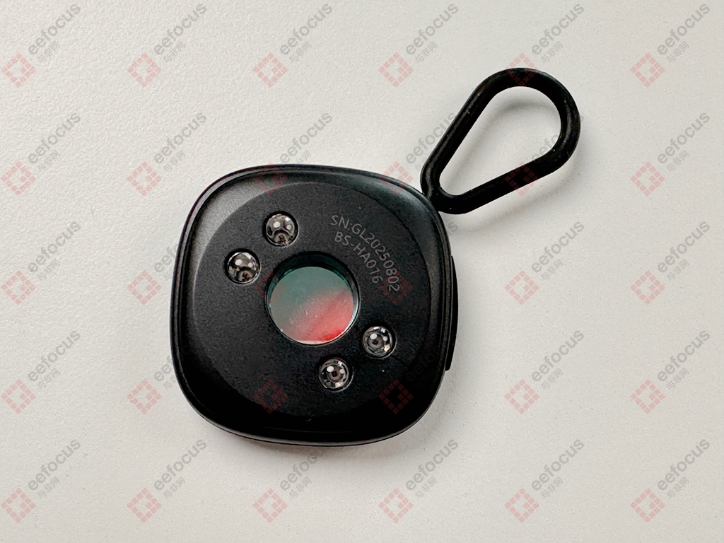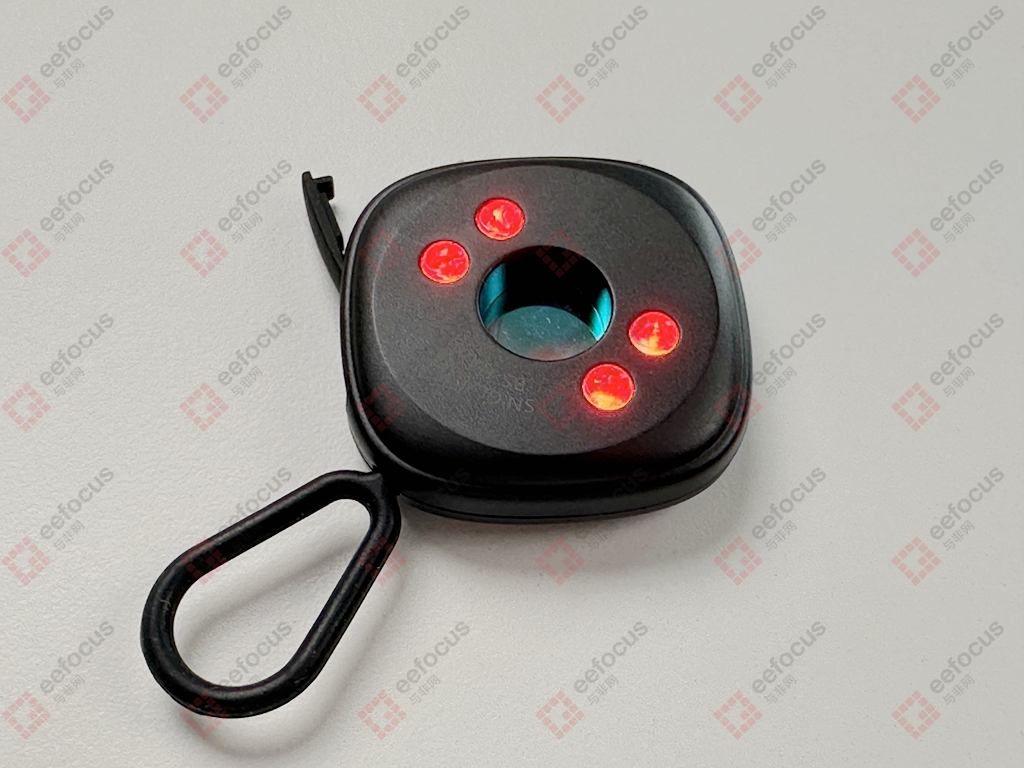 简单介绍下,中间为光学滤镜片,周围4颗为红外LED,当打开红外LED时,如果有摄像头,红外光照射在摄像头镜片上时,通过光学滤镜片可以清晰的看到摄像头反射的红光点,所以原理很简单。同时这个产品红外光有常亮和频闪模式,这是为了方便用户在查到疑似摄像头时切换模式进一步加强甄别。那从这个原理上来看,内部的硬件电路应该较为简单,拆解一探究竟。