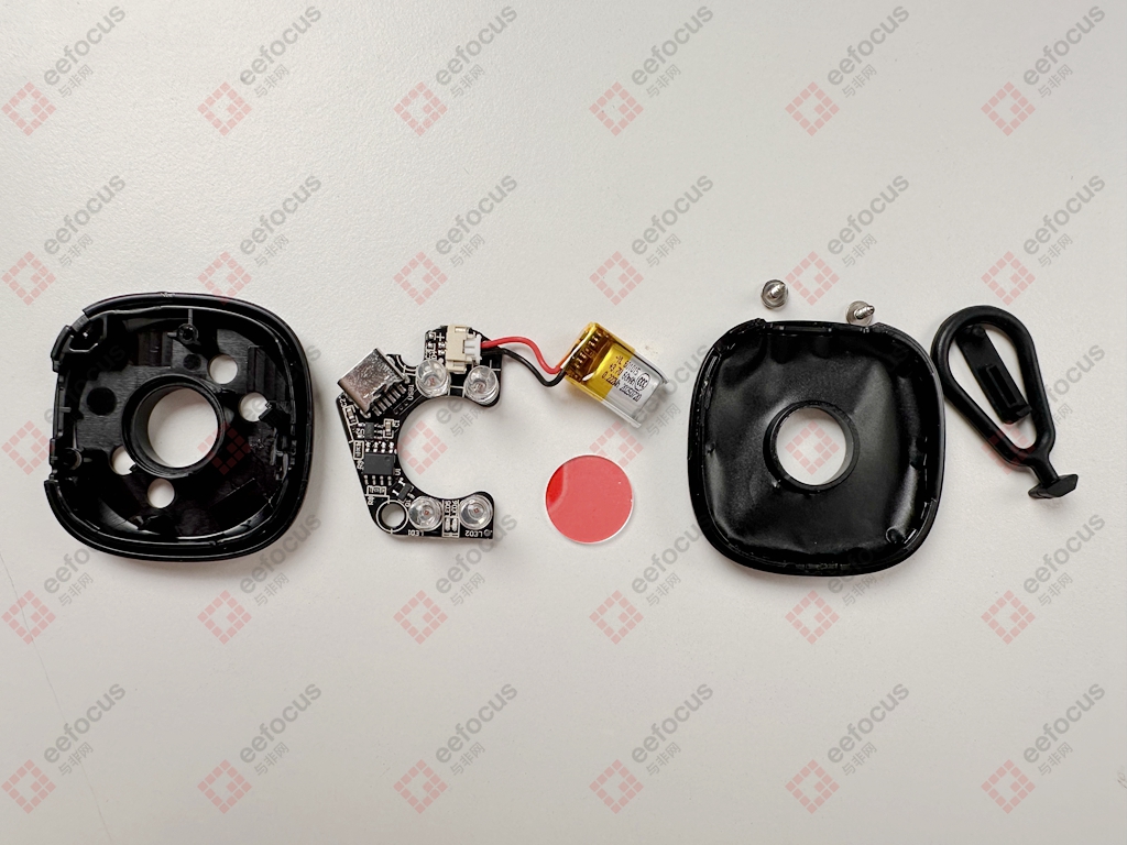 拆解完发现内部硬件更是简单。除了一块红外滤镜片就剩一个U型的PCB主板和电池。光学滤镜片的作用就是过滤环境光,只允许摄像头镜头反射的特定红光通过,使其更容易被肉眼察觉。
