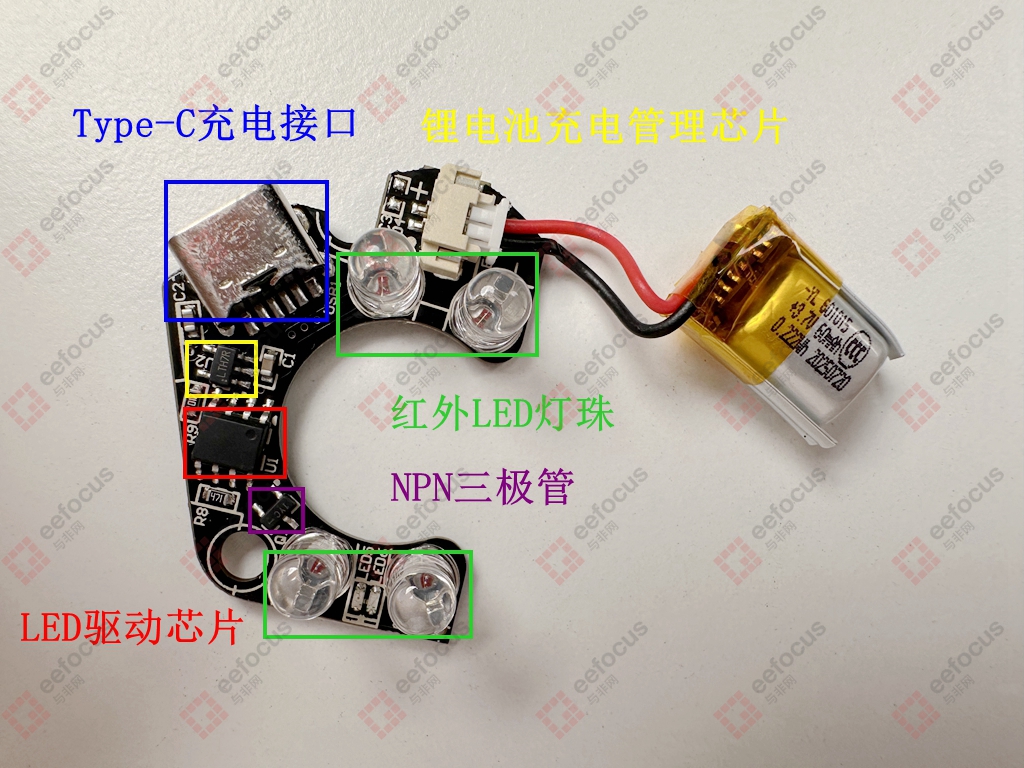 U型主板上的硬件电路就比较简单,4颗红外LED灯珠通过驱动芯片控制,实现长亮和频闪模式。官方宣称探测的距离为5米左右,这是因为要求发射出去的红外光照射可疑区域激发摄像头镜片的反射,再通过光学滤镜片?进行捕获。
