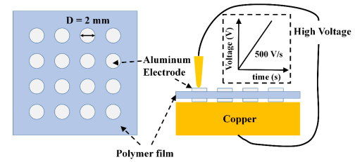 (2)击穿特性:由于聚合物的非理想特性,当向聚合物施加一定电压时,固体电介质中的载流子会定向移动,形成微弱的电导电流;但是当施加电压超过某一临界值时,电介质中电导电流急剧增大而使电介质失去绝缘特性变为导通状态,这一现象被称为电介质的击穿。