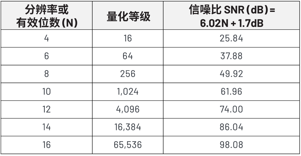 这种误差被称为量化噪声(QuantizationNoise),它将信噪比限制为:SNR=6.02N+1.76dB其中,N=分辨率(比特数)。量化噪声正是ENOB概念的由来。ENOB定义为:测得的ADC或仪器性能等效于一个仅受量化噪声限制的理想ADC时的比特数。举例来说:一个标称12位的示波器若规格中写明ENOB=8位,那么它等效于一个理想的8位ADC。